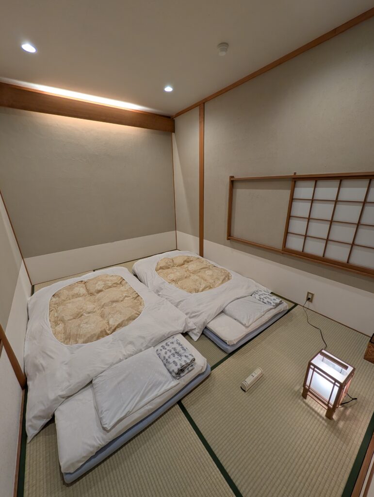 Futons were laid out on the tatami floor—another first for us—and surprisingly, one of the most comfortable nights we had in Japan.